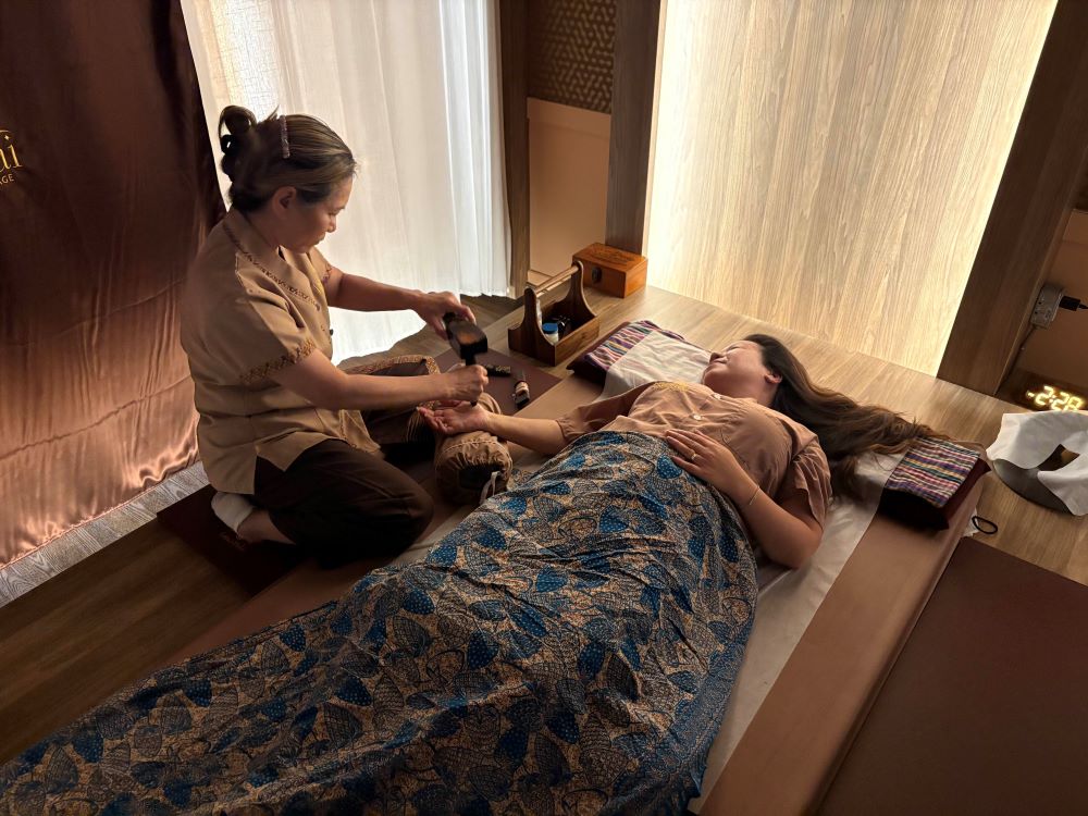 The technique uses a wooden mallet and wedge-like stick. Traditionally, the instruments are carved from Tamarind wood struck by lightning — a symbol of nature’s raw power and transformation. Master Thai Masseuse Pii Saipin at Lamai guided me through the experience by gently tapping along the body’s Sen line,s said to clear blockages and restore balance. Thai Massages are known to work with Sen lines – the energy lines that impact flow.